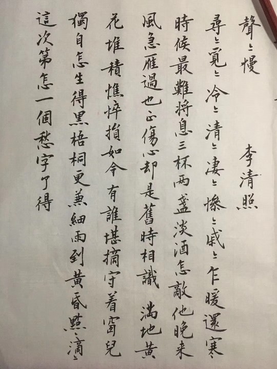 尋尋覓覓,冷冷清清,凄凄慘慘戚戚。乍暖還寒時(shí)候,最難將息。三杯兩盞淡酒,怎敵他、晚來風(fēng)急?雁過也,正傷心,卻是舊時(shí)相識(shí)。