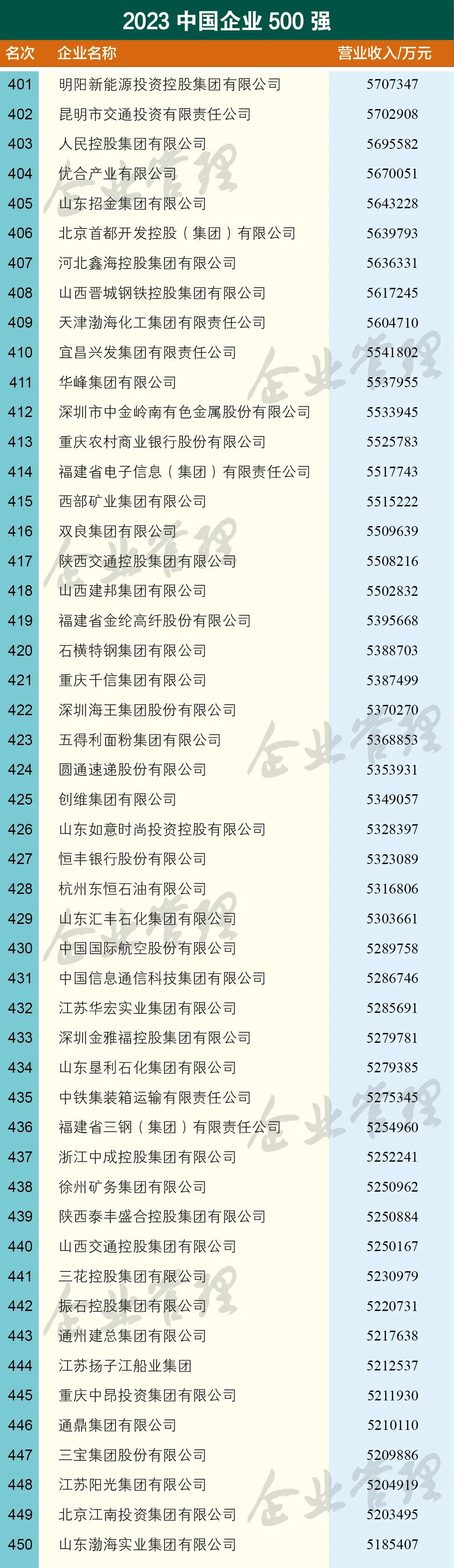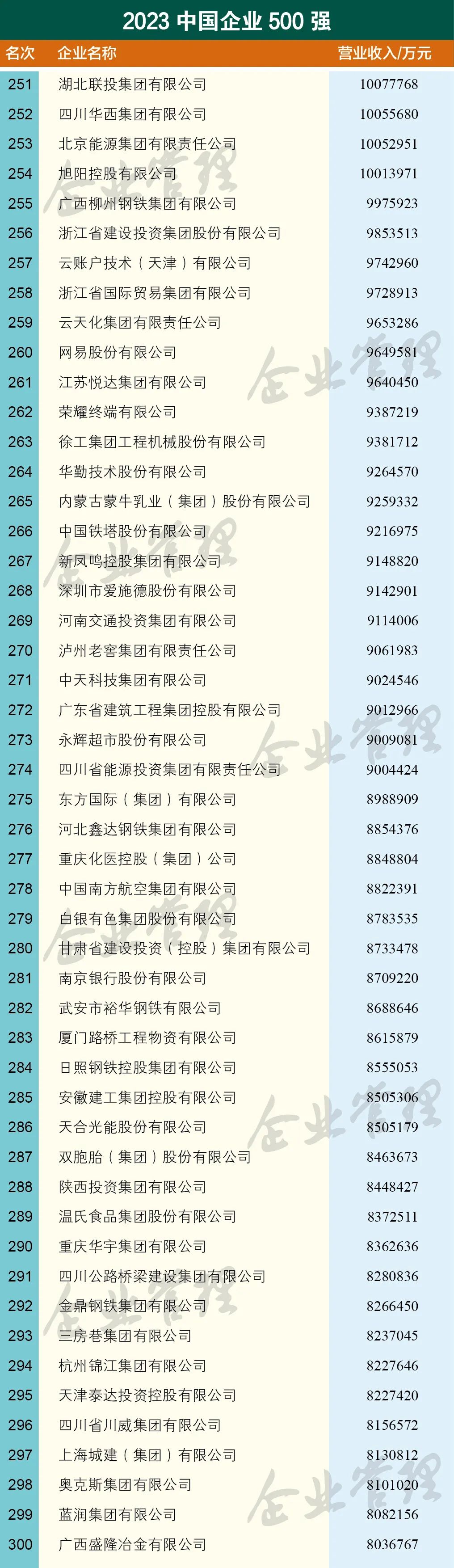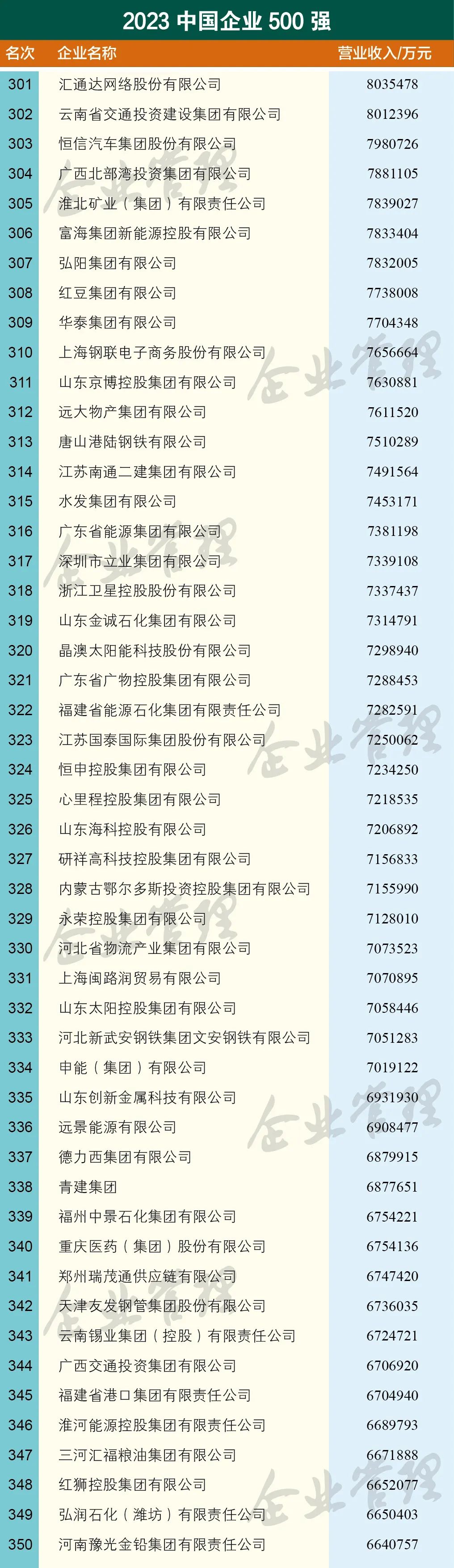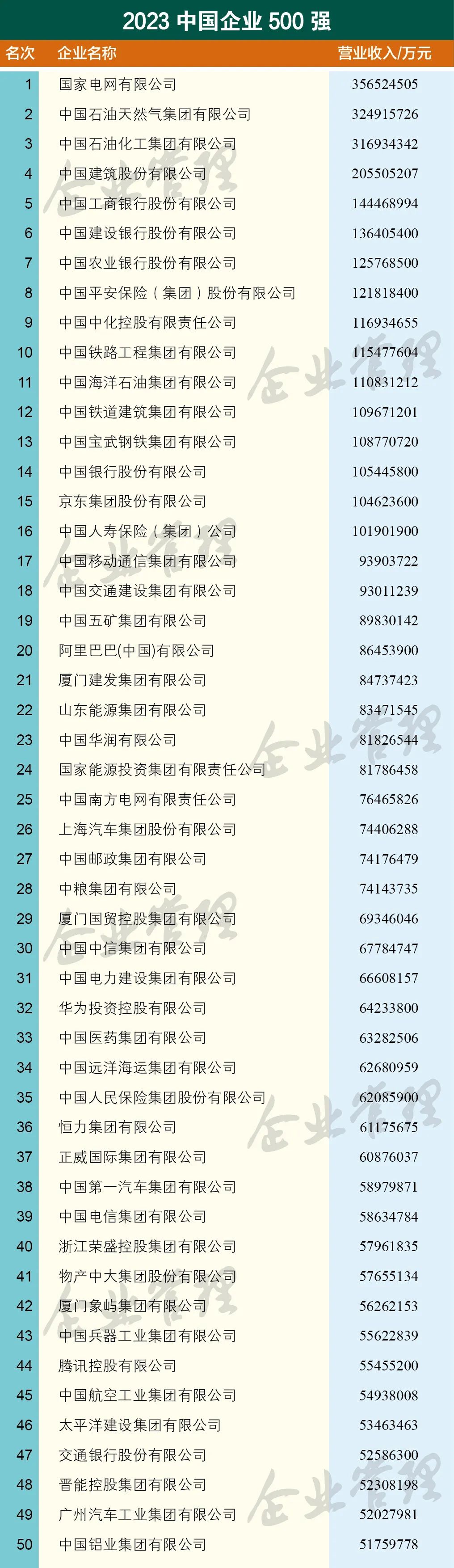 云南上榜中國企業500強的7家企業分別是,云南省投資控股集團有限公司、云南省建設投資控股集團有限公司、云南省能源投資集團有限公司、云天化集團有限責任公司、云南省交通投資建設集團有限公司、云南錫業集團(控股)有限責任公司、昆明市交通投資有限責任公司。國家電網有限公司以3.57萬億營收位列第一,中國石油天然氣集團有限公司以3.25萬億營收排名第二,中國石油化工集團有限公司以3.17萬億營收排名第三。中國建筑股份有限公司、中國工商銀行股份有限公司、中國建設銀行股份有限公司、中國農業銀行股份有限公司、中國平安保險(集團)股份有限公司、中國中化控股有限責任公司、中國鐵路工程集團有限公司進入前十 。
