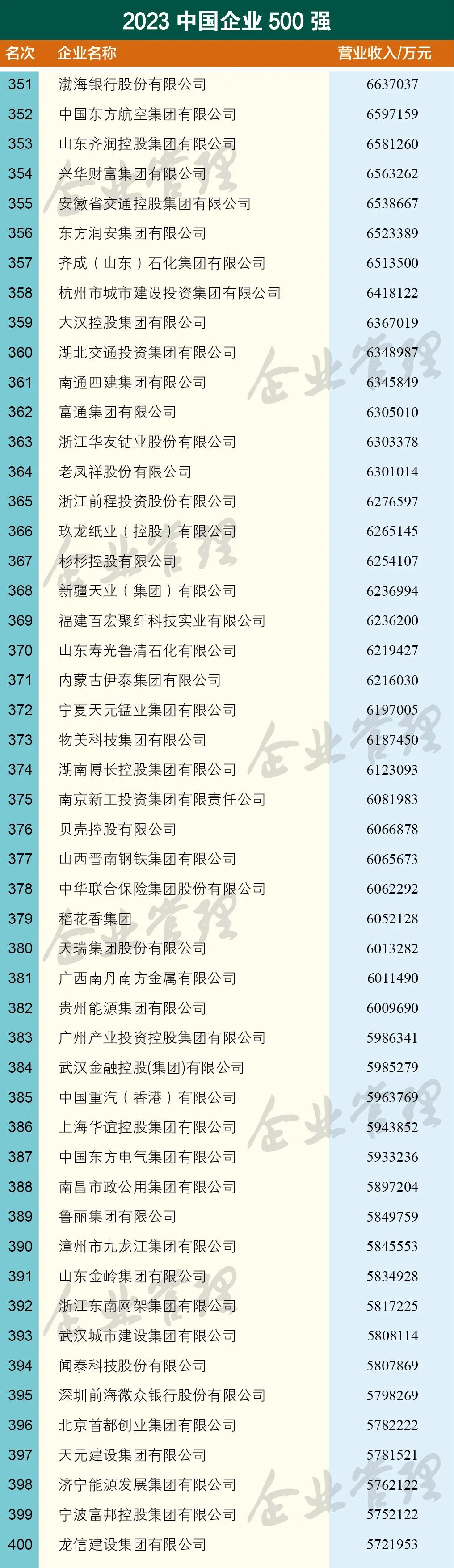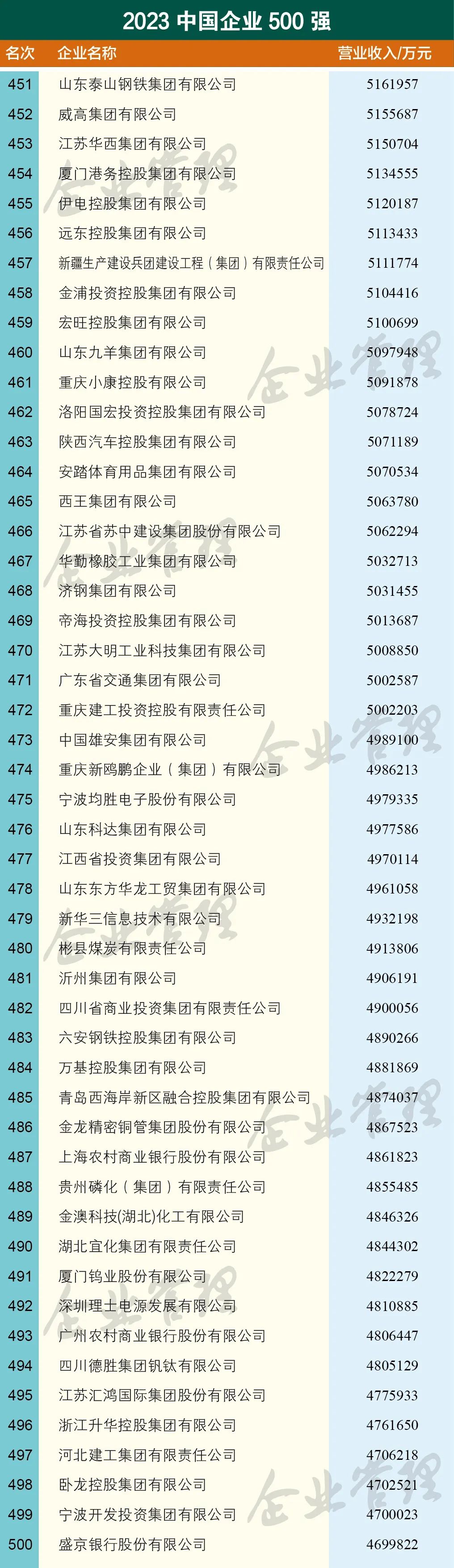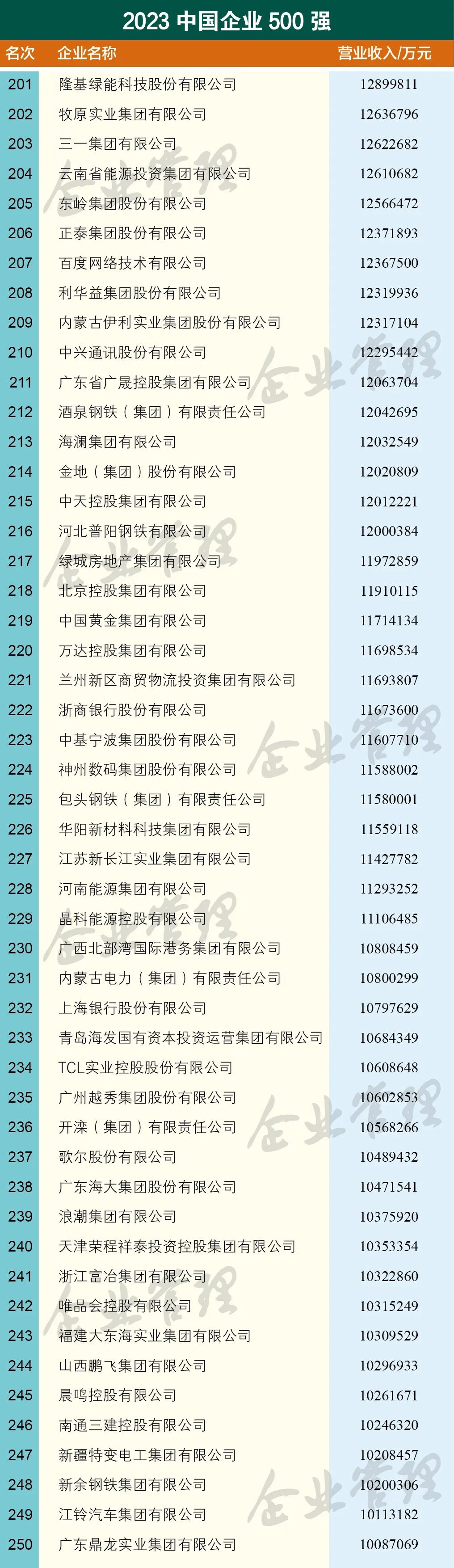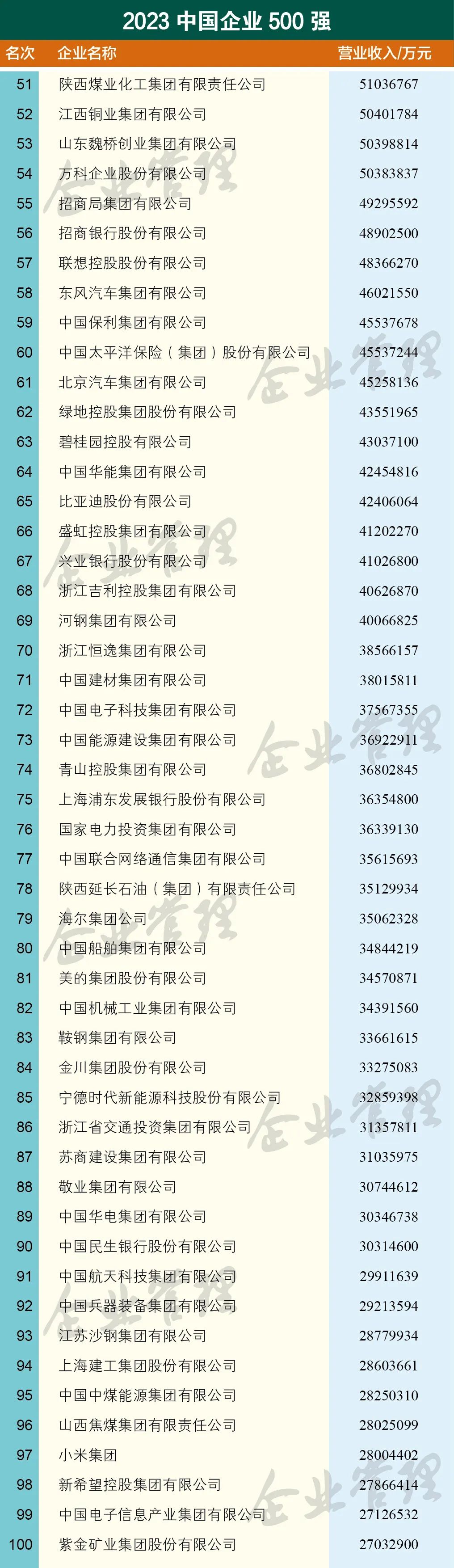 云南上榜中國企業500強的7家企業分別是,云南省投資控股集團有限公司、云南省建設投資控股集團有限公司、云南省能源投資集團有限公司、云天化集團有限責任公司、云南省交通投資建設集團有限公司、云南錫業集團(控股)有限責任公司、昆明市交通投資有限責任公司。國家電網有限公司以3.57萬億營收位列第一,中國石油天然氣集團有限公司以3.25萬億營收排名第二,中國石油化工集團有限公司以3.17萬億營收排名第三。中國建筑股份有限公司、中國工商銀行股份有限公司、中國建設銀行股份有限公司、中國農業銀行股份有限公司、中國平安保險(集團)股份有限公司、中國中化控股有限責任公司、中國鐵路工程集團有限公司進入前十 。