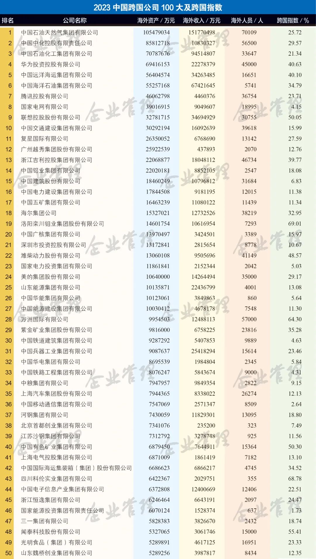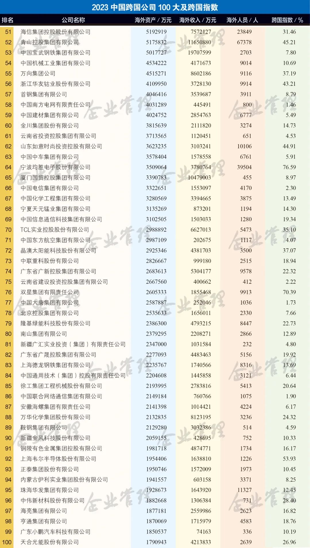 云南上榜2023中國跨國公司100大的2家企業分別是,云南省投資控股集團有限公司、云南省建設投資控股集團有限公司。2023中國100大跨國公司海外營業收入排前10位的企業分別是中國石油天然氣集團有限公司、中國中化控股有限責任公司、中國石油化工集團有限公司、華為投資控股有限公司、中國遠洋海運集團有限公司、中國海洋石油集團有限公司、騰訊控股有限公司、國家電網有限公司、聯想控股股份有限公司、中國交通建設集團有限公司。