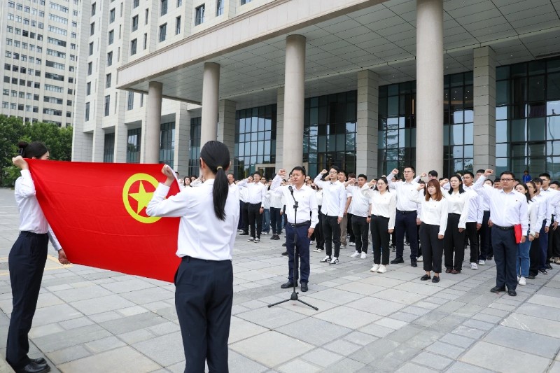 活動現場,集團33家二級單位團組織的100余名青年整齊列隊,在集團大樓東門舉行莊嚴的升國旗儀式,伴隨著高昂的國歌聲響起,五星紅旗在朝陽之下徐徐升起,全體人員行注目禮。