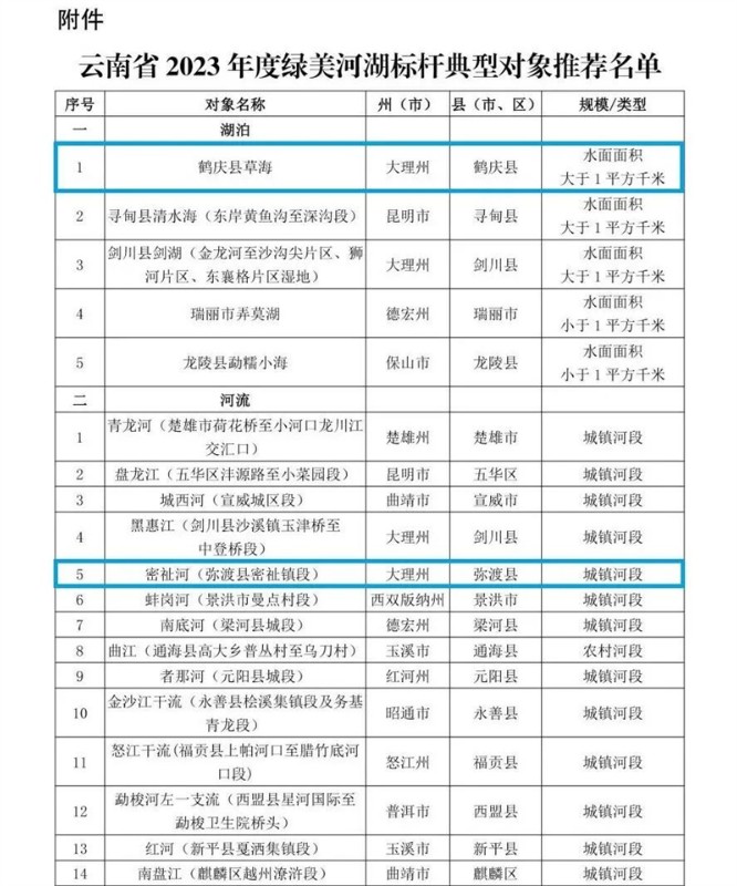 據悉,為認真貫徹落實云南省城鄉綠化美化三年行動的決策部署,推進全省綠美河湖建設,全力打造沿江沿河沿湖綠色生態廊道,努力實現河湖庫渠“安全生態、水清河暢、岸綠景美、人水和諧”的綠美幸福河湖目標,省水利廳經縣級申請、州(市)認定、省級抽查復核、征求意見等流程,確定鶴慶縣草海等50個綠美河湖對象為云南省2023年度綠美河湖標桿典型對象。