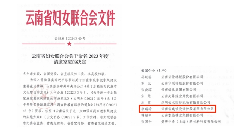 近日,云南省婦女聯(lián)合會(huì)下發(fā)了2023年度云南省“清廉家庭”“書(shū)香家庭”表彰通報(bào),集團(tuán)3戶職工家庭分別獲評(píng)云南省“清廉家庭”“書(shū)香家庭”。其中,云南省城鄉(xiāng)建設(shè)投資有限公司劉春肅家庭、云南建設(shè)基礎(chǔ)設(shè)施投資股份有限公司熊小林家庭獲評(píng)云南省“書(shū)香家庭”;云南省建設(shè)投資控股集團(tuán)有限公司國(guó)際工程部李瑞琦家庭獲評(píng)云南省“清廉家庭”。